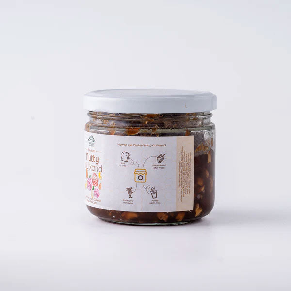 2. PURITY ? : 'The Divine Foods' Nutty Gulkand are free from added additives, artificial colors, flavors and adulterants. It is 100% pure and has natural taste and aroma which enhances the flavor of every dish it is added to.
