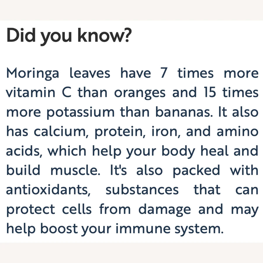 2. HIGH ON NUTRITION? : Moringa has many important vitamins and minerals. The leaves have 7 times more vitamin C than oranges and 15 times more potassium than bananas. it has antioxidants, substances that can protect cells from damage and may boost your immune system