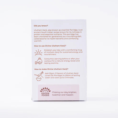 5.PACKAGE CONTENT: 200g with goodness of Packed with protein and nutrients, provides energy for the day. The Divine Foods' Ulutham kanji is free from added additives, artificial colours, flavours, adulterants and preservatives. It is 100% pure, organic and certified as pesticide free.